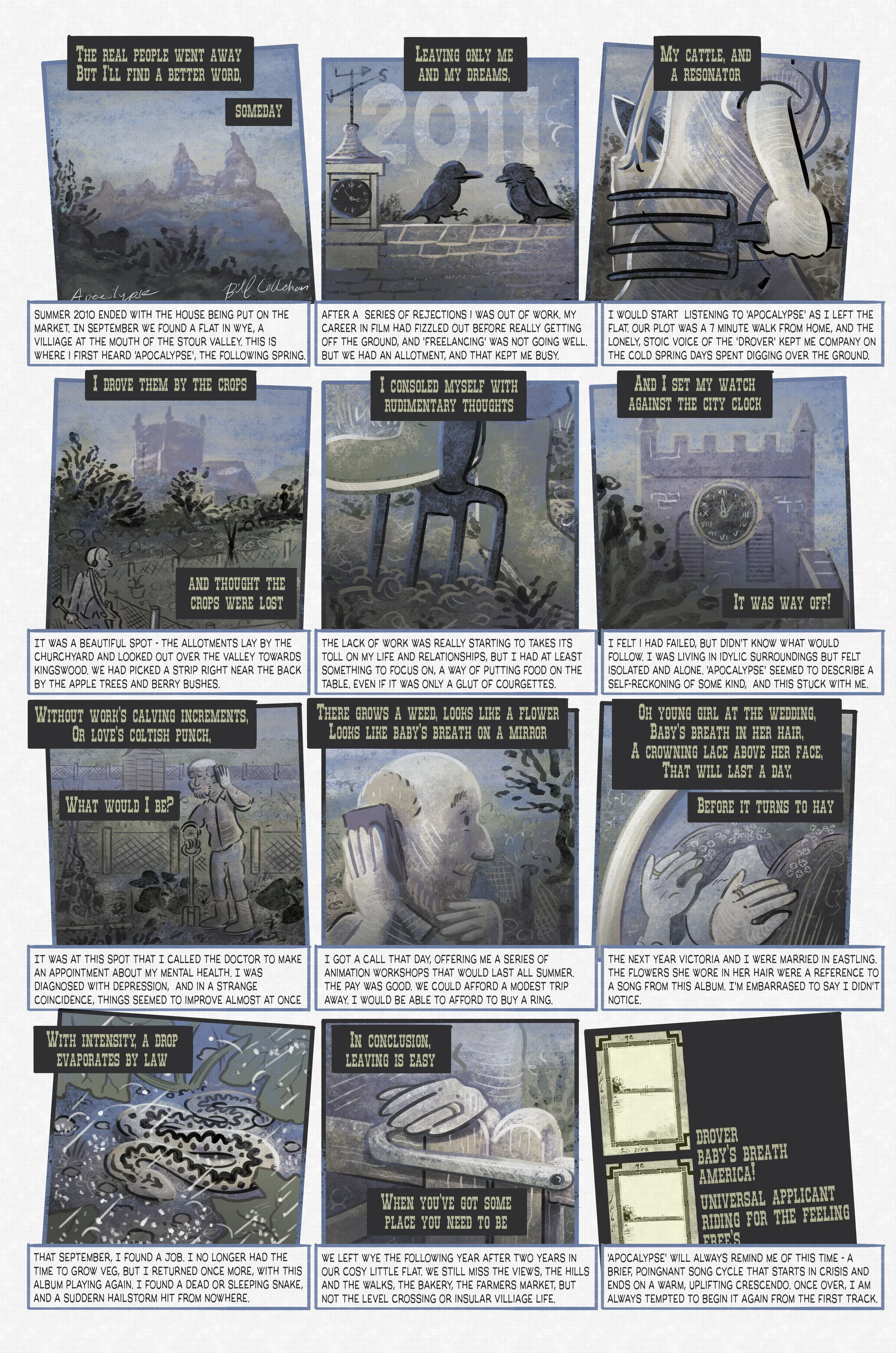My second comic in this series takes me back to 2011 and Bill Callahan’s sublime ‘Apocalypse’. This is another one of those albums that I got to know so well in such a brief time that it gives me an intense sensory memory – an almost tangible evocation of a moment in time.